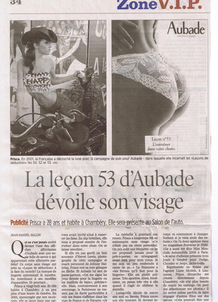 Si elle ne ressent pas une fierté particulière à être associée à une publicité aussi célèbre (et qui fait fantasmer autant de garçons et de filles) que celle d'Aubade, ni ne garde un très bon souvenir d'Hervé Lewis, Prisca relève que c'est cela qui l'a fait décoller dans le milieu de la lingerie ... AUBADE - on s'en serait presque douté - est une très belle carte de visite dans le domaine photographique.