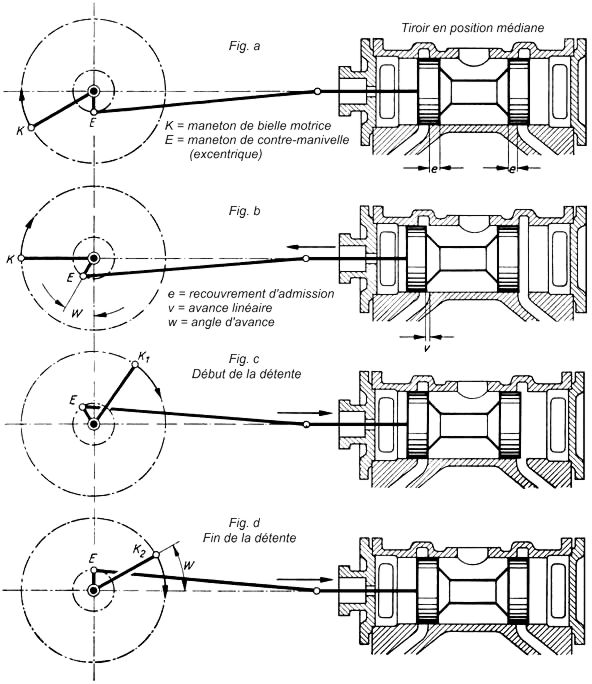 La course du piston à disposition pour la détente est significativement plus longue, la manivelle arrive plus près du point mort K2 (fig. 88c) et, après l'introduction du recouvrement d'échappement, la détente de la vapeur est mieux utilisée.