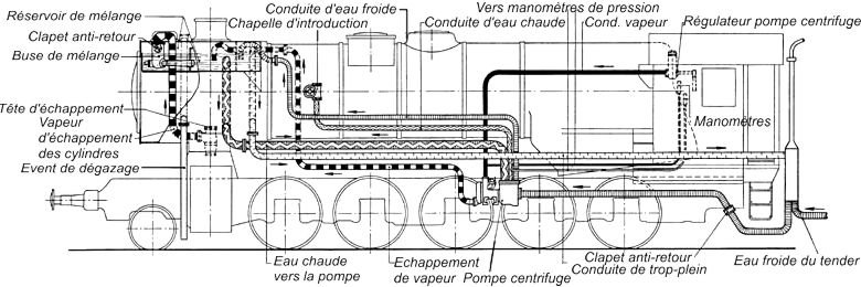 L'eau venant du tender traverse la partie à eau froide de la pompe d'alimentation centrifuge à deux étages pour être acheminée vers le réservoir de mélange (réservoir d'eau chaude) situé devant et sur la boîte à fumée. La vapeur d'échappement de la machine à vapeur est prélevée au-dessous de la tuyère d'échappement et dirigée vers une buse de mélange disposée dans le réservoir de mélange. Cette-dernière se trouve dans la chambre à eau et sert simultanément à mettre l'eau en mouvement afin qu'elle se réchauffe rapidement en se mélangeant intimement avec la vapeur condensée. L'échappement de la pompe centrifuge et de la turbodynamo (générateur d'électricité à vapeur) est également dirigé dans la chambre de mélange. L'eau chaude s'écoule de celle-ci vers la chambre à eau chaude de la pompe centrifuge et est poussée par la chapelle d'introduction dans la chaudière. Un clapet anti-retour placé avant la buse de mélange (flotteur qui, avec l'élévation du niveau d'eau ferme la conduite de vapeur d'échappement) empêche l'eau de passer dans la tuyère d'échappement et les cylindres. L'eau superflue retourne par le trop-plein muni d'un conduit (évent) de dégazage vers la conduite d'alimentation d'eau froide de la pompe.